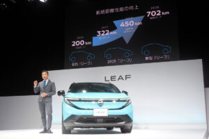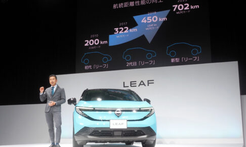 新型リーフにはアリアと同じCMF-EVプラットフォームが採用され、室内のフラットフロア化やファストバック・シルエットによってCd値0.26をマークしている。航続距離(WLTCモード測定値)は702km(19インチタイヤ装着車は685km)。