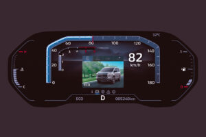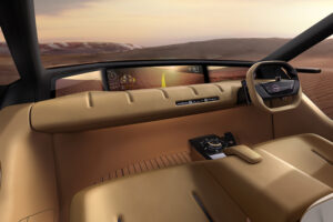 カーキ色のソフトレザーで守られ感を演出するコックピットにはAIコ・ドライバーが組み込まれている。センサーが読み取った路面状況に応じて最適なドライブモードが提案される。コックピットにはシースルーボンネットとしてノーズ直下の様子を映し出すモニター画面と、左右ドアミラーの代わりを果たすモニターを配備。