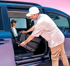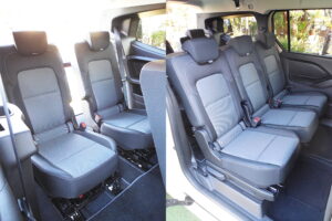 室内には3列目シートが追加されていて7人乗りを実現。2列目(3人分)と3列目(2人分)の各シートは全て独立していて別々に130mmスライド&脱着できる。また、3列目への乗降性を高めるため、2列目にはダンブル機構が採用されている。