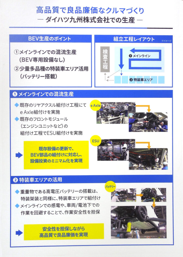 今回リリースされたBEVはエンジン車と同じくダイハツ九州の大分工場で組み立てられる。しかもBEV専用設備を新たに導入することなく、投資を抑えてエンジン車と混流生産できる体制を構えた点が見逃せない。eアクスルなどの電動系コンポーネンツは生産ラインで組み付けられ、最後のバッテリー搭載だけは特装車を手がけるエリアに車両を移して行われる。関係者によると「バッテリー搭載前はエンジン車より軽いため、手押しで車両を(エリアへと)移動させる」とのことで、バッテリーの組み付けは1台あたり30分ほどで終わるという。これまで特装車を仕上げるためのドックは6つ用意されていたが、バッテリー搭載工程を担うにあたって8つに増やされた。