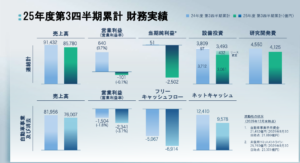 昨日、2月12日、日産自動車が第3四半期決算説明会を行った。要点は以下の3つだ。大手メディアは「6500億円の赤字」にフォーカスした報道を行なっているが、注目すべきは関税影響を含んで第3四半期に営業黒字転換したことです。175億円の数字はまだまだ小さいですが、リストラが進捗していることを数字が示しています。本日、2月13日の株価は30円程度上昇している。